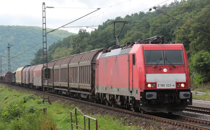 Die 186 323-2 zieht 2014 einen Zug aus Schienentransportwagen durch das schöne Maintal. copyright: Marco Löffler